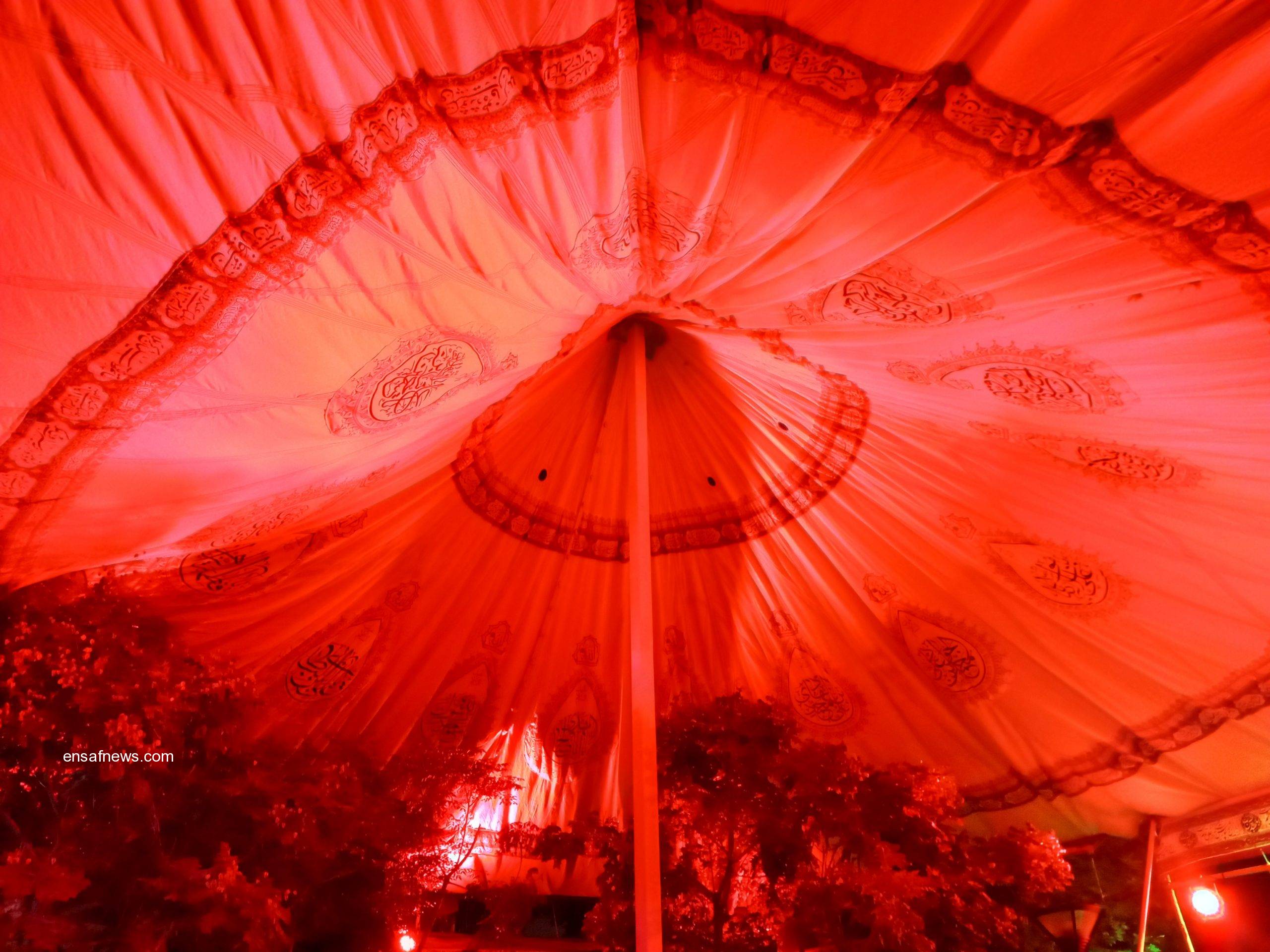 اینجا همیشه در این ایام شلوغ است. عزادارن نه فقط زیراندازهایی که مقابل صفحه نمایش بزرگ بیرون از مسجد پهن شده را پر میکنند که بسیاری همراه خود زیرانداز میآورند و فضای سبز اطراف هم پر میکنند. آنها که دورتر زیراندازشان را پهن میکنند معمولا خانوادگی آمدهاند. بخش زنانه در فضای آزاد را چادری جدا کرده بود تا در معرض دید نباشد.