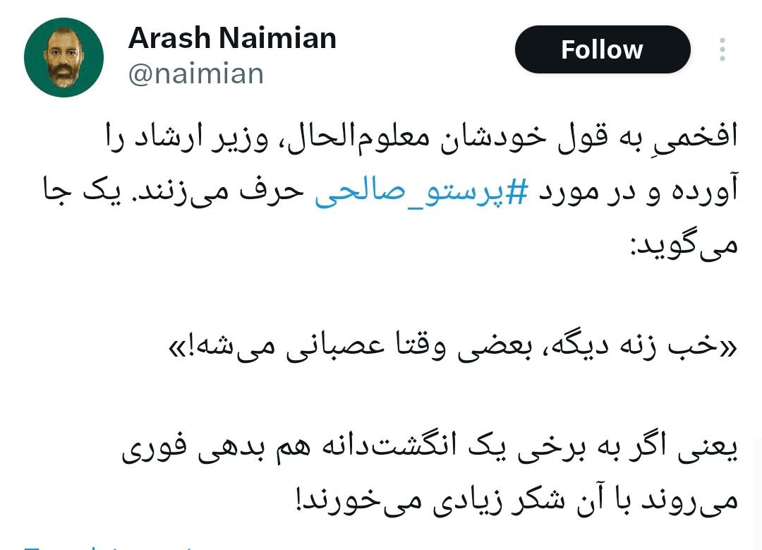 جملهای که شاید بهروز افخمی فکرش را هم نمیکرد این اندازه با واکنشهای منفی مواجه شود. در همینباره آرش نعیمیان (کارگردان و مترجم) در توئیتی به این جمله واکنش نشان داد: