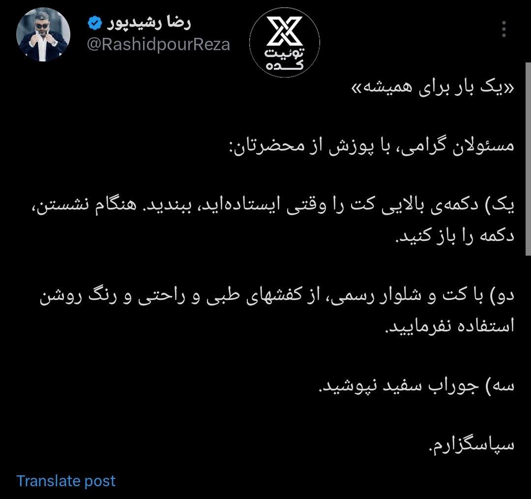 رضا رشیدپور، مجری سابق صداوسیما با انتشار یک توئیت به استایل برخی مسئولان واکنش نشان داد.