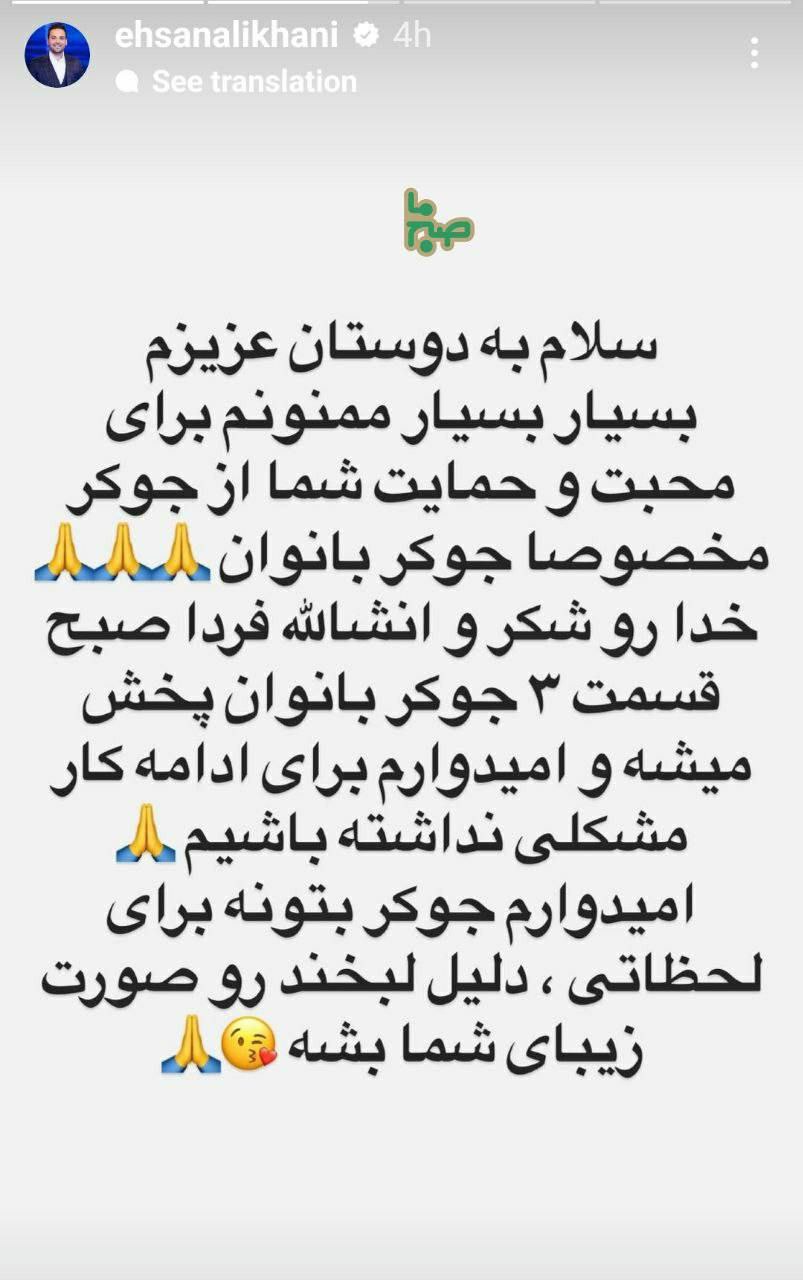 احسان علیخانی در یک استوری خبر از پخش جوکر زنان داد.