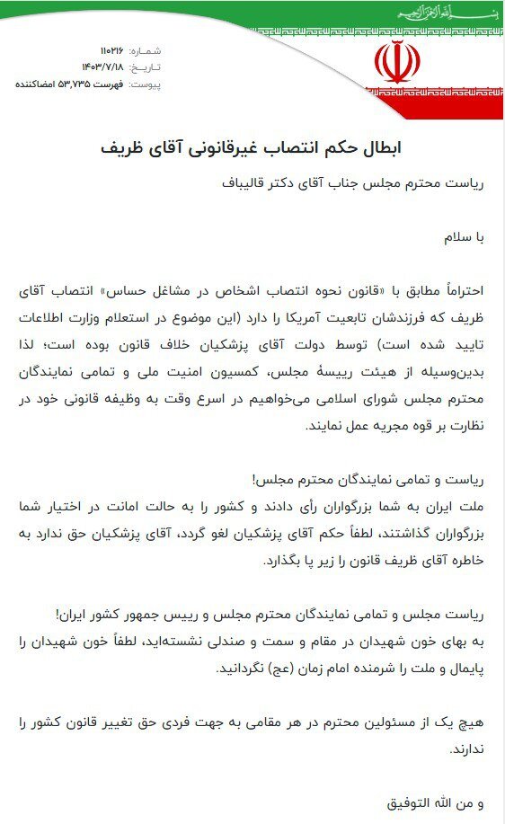 ستاد امر به معروف و نهی از منکر تهران نیز با به راه انداختن یک کارزار علیه ظریف، حکم انتصاب او را غیرقانونی دانسته است. همچنین این ستاد در کارزار مذکور خواهان آن شده که مردم با امضا کردن آن مانع حضور ظریف در دولت شوند. در ادامه تصویری از این کارزار را مشاهده می کنید.