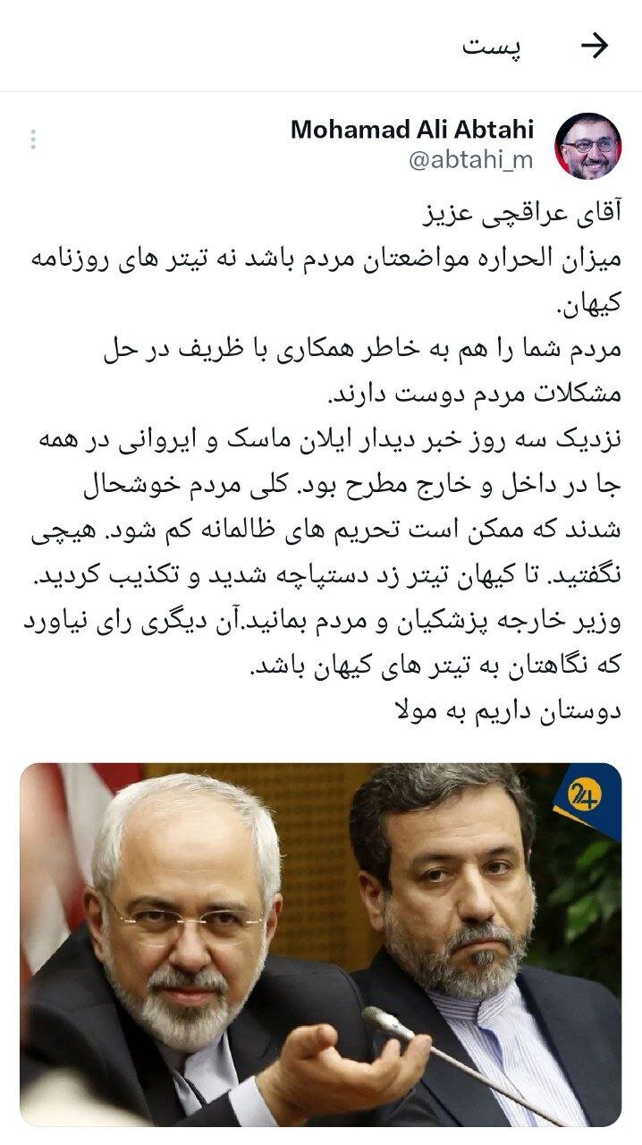 محمد علی ابطحی، توصیه ای معنادار خطاب به وزیر امورخارجه منتشر کرد.