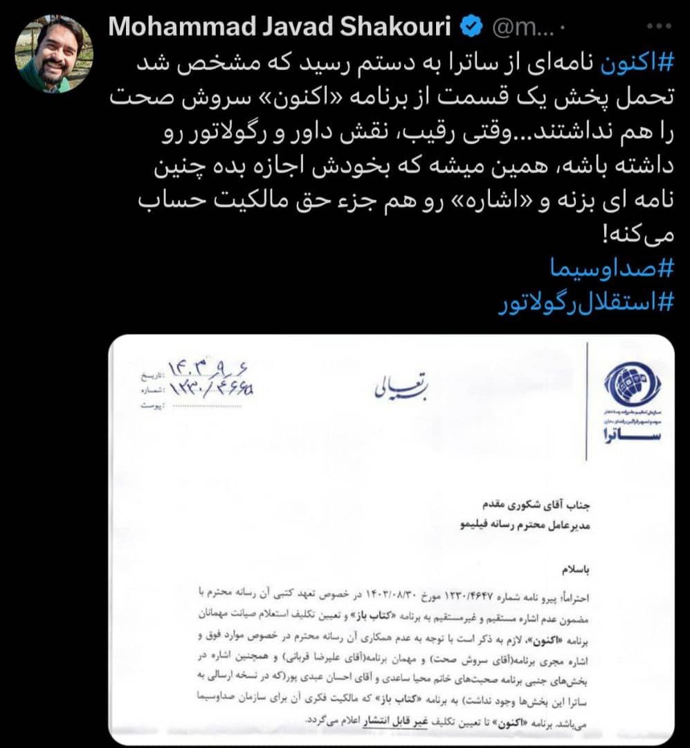 اکنون نامهای از ساترا به دستم رسید که مشخص شد تحمل پخش یک قسمت از برنامه «اکنون» سروش صحت را هم نداشتند…وقتی رقیب، نقش داور و رگولاتور رو داشته باشه، همین میشه که بخودش اجازه بده چنین نامه ای بزنه و «اشاره» رو هم جزء حق مالکیت حساب میکنه!