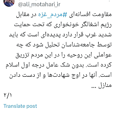 علی مطهری نماینده ادوار مجلس در شبکه ایکس نوشت: «مقاومت افسانه‌ای مردم غزه در مقابل رژیم اشغالگر خونخواری که تحت حمایت شدید غرب قرار دارد پدیده‌ای است که باید توسط جامعه شناسان تحلیل شود که چه عواملی این روحیه را در این مردم تزریق کرده است. بدون شک عامل درجه اول اسلام است. آنها در اوج شهادت‌ها و از دست دادن منازل فریاد حسبنا الله (خدا برای ما کافی است) سر می‌دادند.  زنان آنها در سخت‌ترین شرایط پوشش کامل اسلامی داشتند بدون آنکه قانون عفاف و حجابی در کار باشد.  ناسیونالیسم عربی چنین قدرتی ندارد، ایمان به مقام شهادت است که این روحیه را پدید آورده است. چنین ملتی فلسطین را آزاد خواهد کرد.»