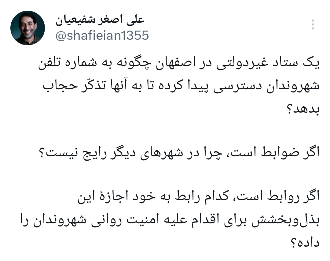 شفیعیان در توییتش از دسترسی ستادی غیردولتی به شماره‌های شهروندان برای تذکر حجاب گفته و آن را نقد کرده است.