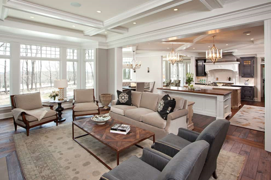- تنظیم وسایل با فرش: برای تنظیم وسایل با فرش سه روش وجود دارد که به نحوه قرارگیری وسایل بر روی فرش برمیگردد. برای اینکه منزل شما اشرافیتر به نظر بیاید میتوانید از فرشی استفاده کنید که همه سطح زمین را بپوشاند. راه دیگر این است ۱۲ تا ۱۸ اینچ از سطح زمین را خالی بگذارید. و در آخر اگر اتاق کوچکی در اختیار شما قرار دارد و یا یک خانه نقلی دارید، پهن کردن یک فرش نسبت به پهن کردن یک قالیچه انتخاب بهتری است. فقط توجه داشته باشید تا پایههای جلویی صندلیها بر روی فرش قرار بگیرند