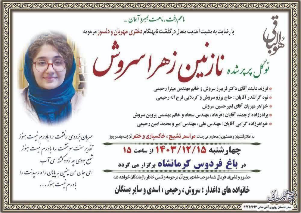 نازنین زهرا سروش، نوگل پرپر شده ای که به آغوش معبود و به دیار باقی شتافت دانش آموز نخبه پایهی دوازدهم دبیرستان نمونه دولتی فاطمیه(س) ناحیه سه بود که در تاریخ هفتم اسفندماه بر اثر حادثه سقوط از پلکان در منزل شخصی دچار حادثه شد و در تاریخ چهاردهم اسفند ماه سال جاری به دیار معبود رجعت کرد و همه ما را در غم و اندوه فرو برد.