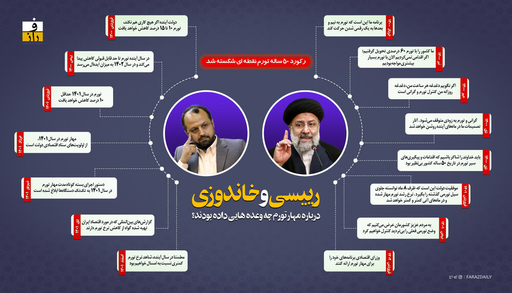 در این اینفوگرافی، به مناسبت رکوردشکنی تورم نقطهبهنقطه در نیم قرن اخیر، تعداد قابل توجهی از وعدههای ابراهیم رییسی و احسان خاندوزی، وزیر اقتصاد دولت سیزدهم نوشته شده است.