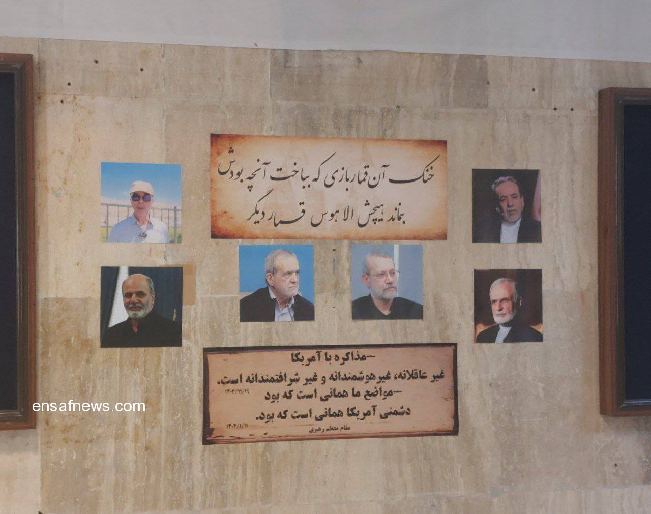 همین که پایگاه خبری انصاف نیوز از تابلوی اعلانات بسیج دانشجویی دانشکده حقوق دانشگاه تهران منتشر کرده است؛ “تصویر چهرههایی همچون مسعود پزشکیان، رئیسجمهور، عباس عراقچی، وزیر خارجه؛ علیاکبر احمدیان، دبیر شورای عالی امنیت ملی، سرلشکر محمد باقری، فرمانده کل نیروهای مسلح و علی لاریجانی، مشاور رهبر انقلاب کنار یکدیگر قرار داده شده و نسبت به هرگونه رویکرد مذاکرهمحور با آمریکا هشدار داده شده است.” اگر این خنجر زنی از پشت نیست پس چیست؟ کلمات بار خود را دارد و معنای خود و حتی طعم خود را دارد.