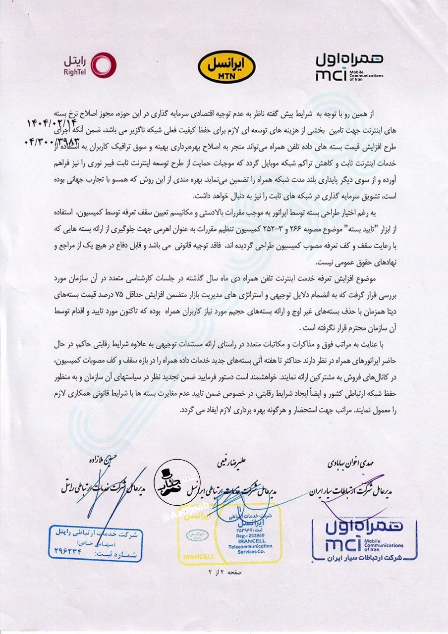 این اپراتورها خواستار افزایش ۷۵ درصدی قیمت بستههای اینترنت شدهاند.