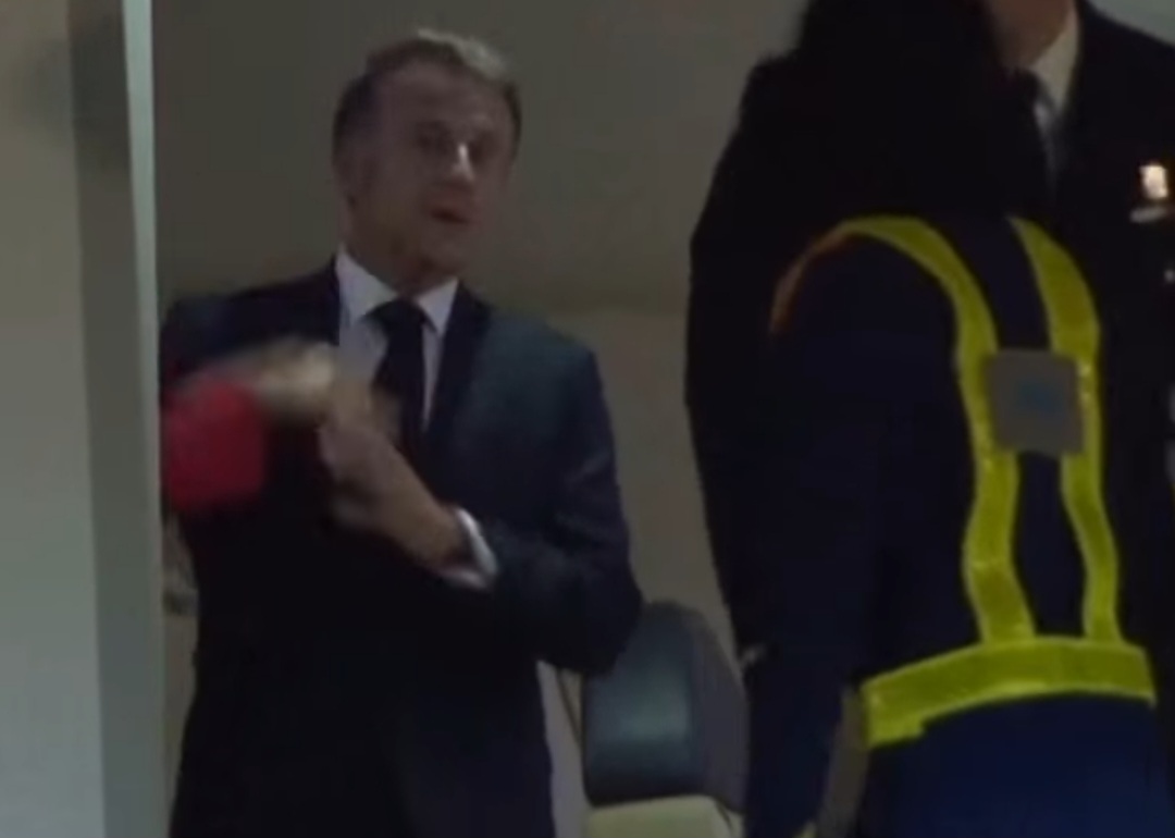 مکرون در این لحظه ابتدا کمی متعجب به نظر میرسد سپس با لبخندی دست تکان میدهد و هر دو از هواپیما پیاده میشوند.