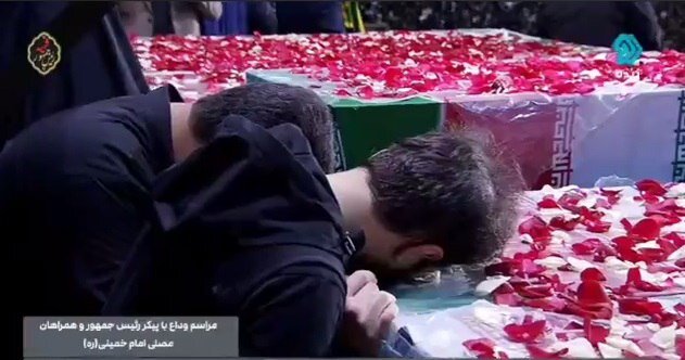 بوسه فرزند سردار قاسم سلیمانی بر تابوت پیکر رئیسی و همراهانش