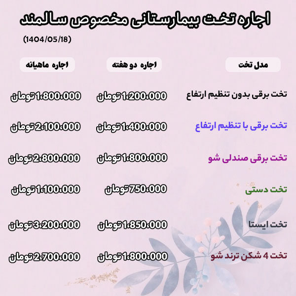 - تخت بیمارستانی نیمه برقی: سالمندان و بیمارانی با توان حرکتی متوسط که نیاز به تنظیمات سریع و آسان دارند و میخواهند تا حدودی خود نیز بر روی تغییرات زاویه تخت تسلط داشته باشند، اجاره تخت بیمارستانی نیمه برقی پیشنهاد می شود.