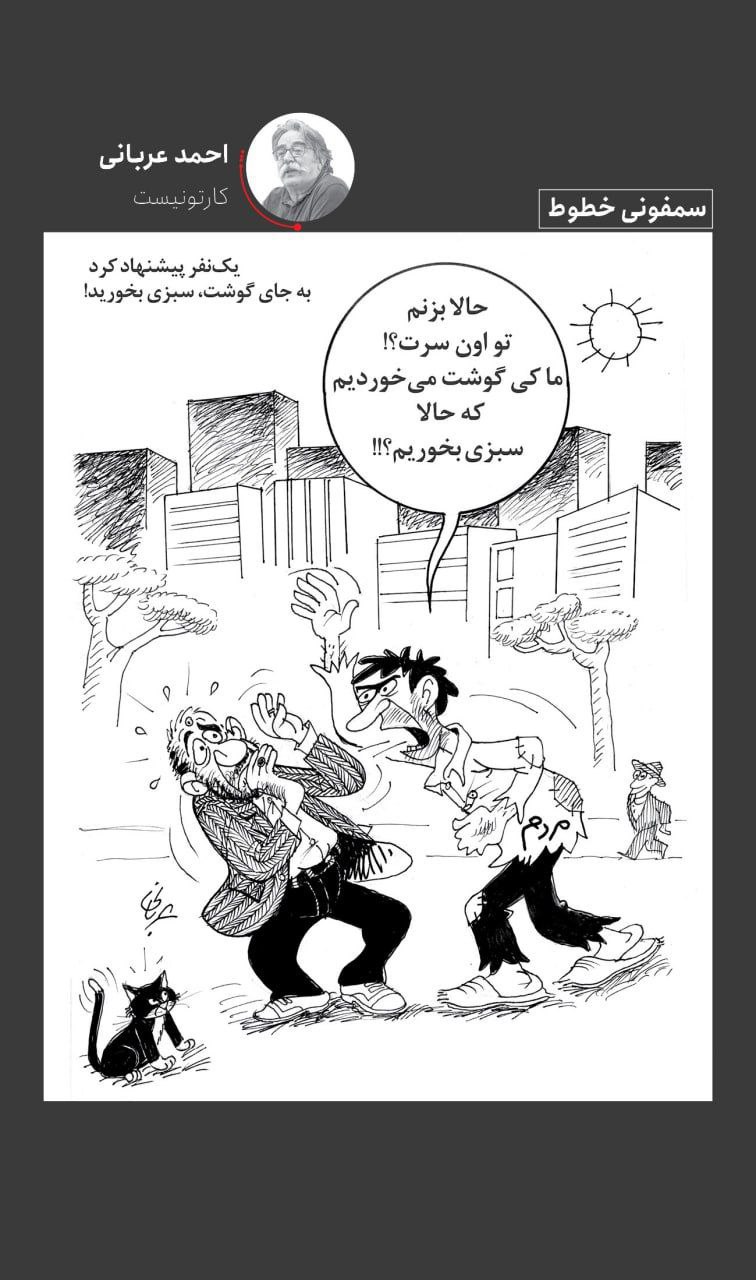 هممیهن: یک نفر پیشنهاد کرد به جای گوشت، سبزی بخورید! موضوعی که احمد عربانی در کاریکاتور خود، آن را به تصویر کشیده است.