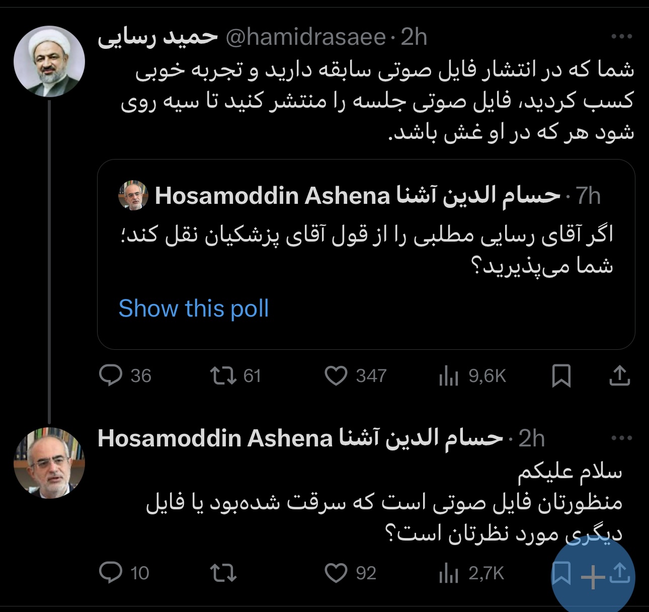رسایی در واکنش نوشته کنایهای زده و نوشته است «شما که در انتشار فایل صوتی سابقه دارید و تجربه خوبی کسب کردید، فایل صوتی جلسه را منتشر کنید تا سیه روی شود هر که در او غش باشد.»