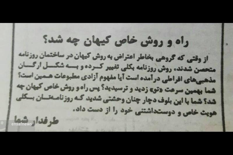 در ۱۷ بهمن ۵۷ یکی از مخاطبان روزنامه کیهان با انتقاد از تغییر روش این روزنامه در ستون کیهان و شما نوشته بود: از وقتی گروهی بخاطر اعتراض به روش کیهان در ساختمان روزنامه متحصن شدند روش روزنامه به کلی تغییر کرده و به شکل ارگان مذهبیهای افراطی در آمده است.
