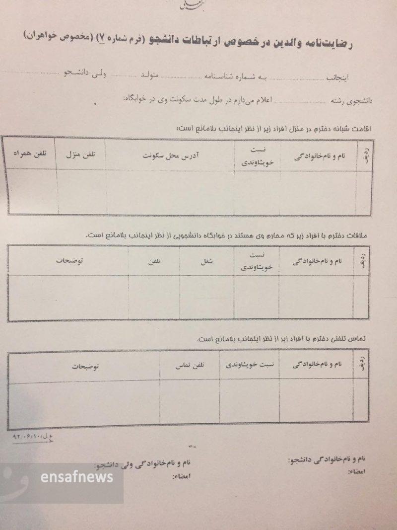 در این رضایتنامه علاوه بر مشخص کردن افرادی از سوی والدین که دانشجوی دختر مجاز به اقامت در منزل آنها هست، قسمتی نیز برای تعیین و تأیید افرادی که تماس تلفنی دانشجو با آنها از نظر والدین مانعی ندارد، اختصاص داده شده است.