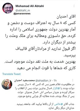 ابطحی عضو مجمع روحانیون مبارز به توئیت اخیر مشاور قالیباف علیه رئیس دولت اصلاحات واکنش نشان داد.