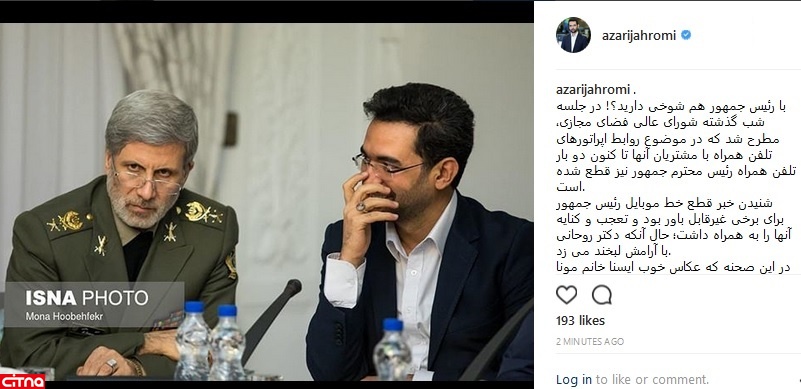 به گزارش سیتنا، آذری جهرمی، وزیر ارتباطات و فناوری اطلاعات، در اینستاگرامش ذیل عنوان “با رئیس جمهور هم شوخی دارید؟!” نوشت: