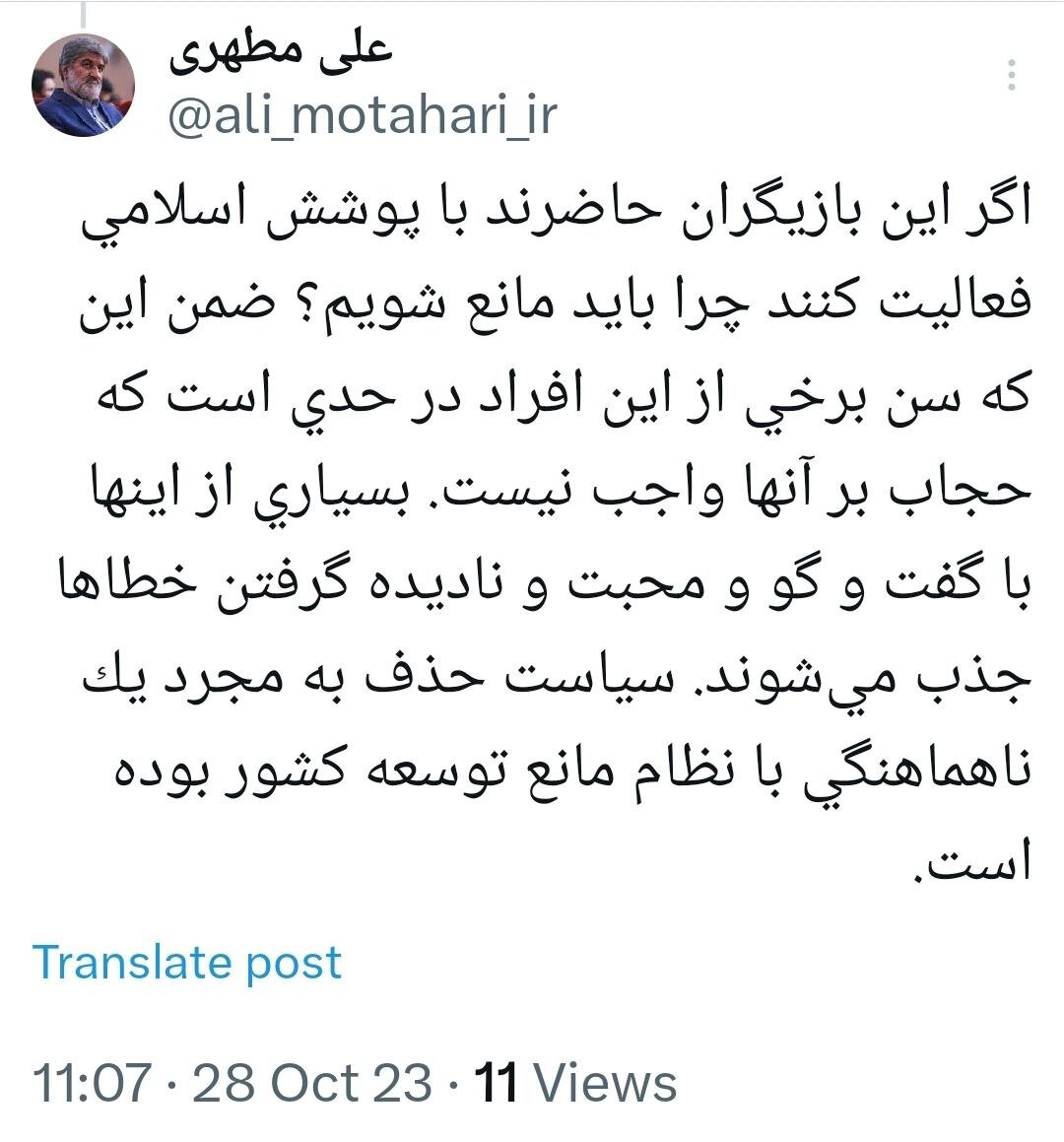 خبرآنلاین نوشت: علی مطهری درباره منع فعالیت سلبریتی های زن به دلیل کشف حجاب توئیتی منتشر کرد. علی مطهری نماینده سابق مجلس شورای اسلامی در رشته توئیتی در شبکه اجتماعی ایکس نوشت: