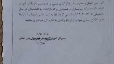 طبق اطلاع خبرنگار انصاف نیوز، نامهای با موضوع «خودداری از ثبتنام دانشآموزان اتباع دارنده برگه سرشماری و برگه بازگشت به…
